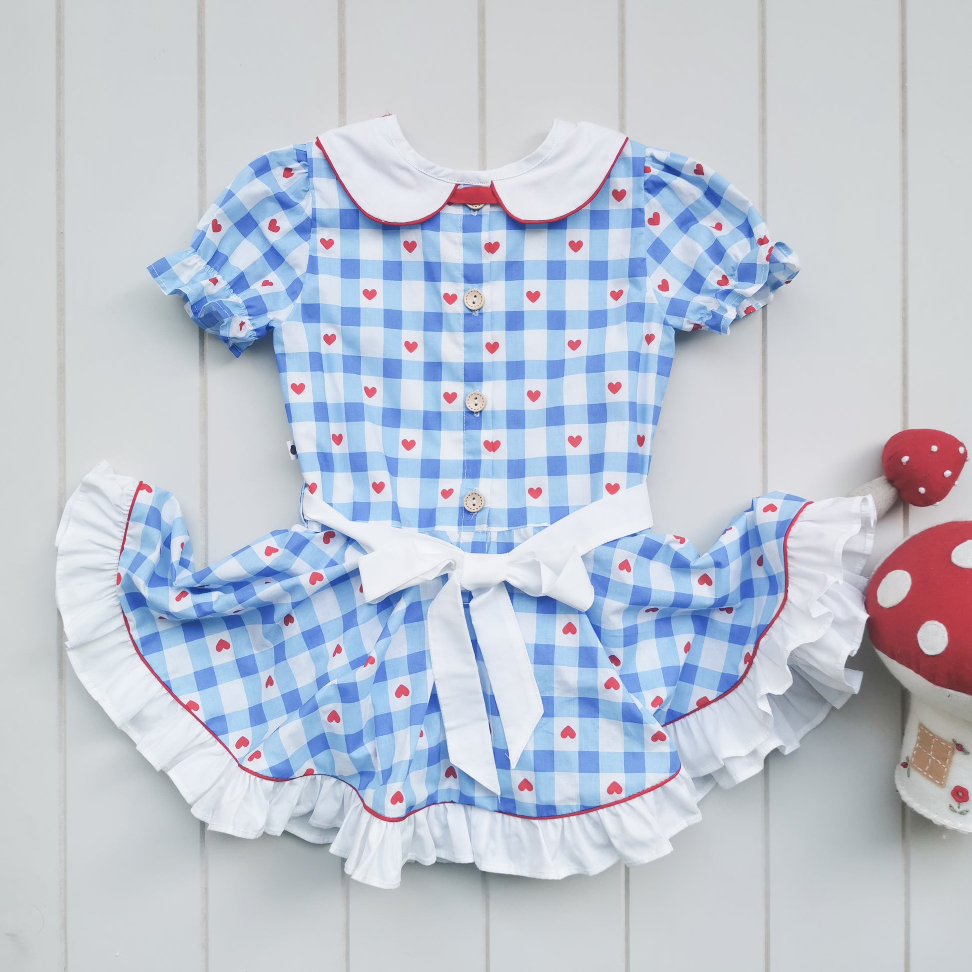 Our adorable Trish Frilly Romper is here to steal hearts! Featuring a charming blue gingham print with delicate red hearts, this romper is perfect for creating a playful, vintage-inspired look. The super short, ruffly skirt comes with attachable bloomers for comfort and coverage, and the sweet, detachable apron adds versatility—ideal for dress-up or everyday fun!