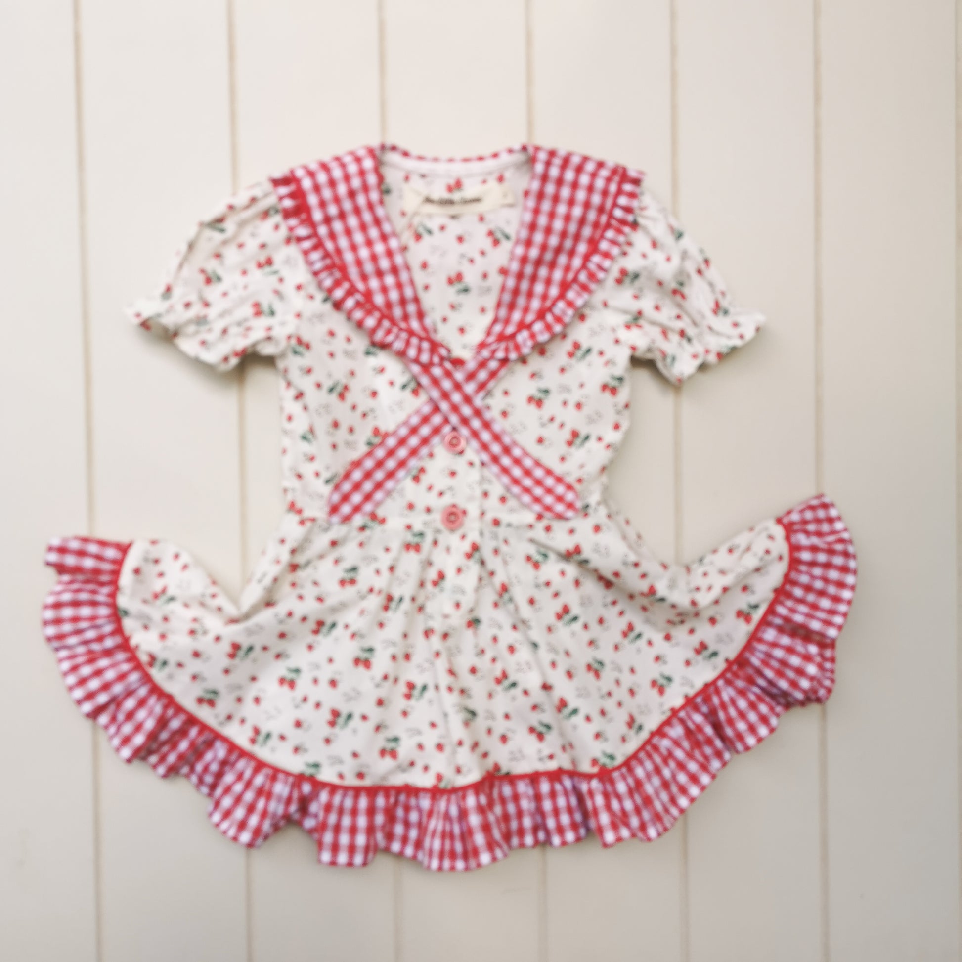 The print is pure joy — tiny cherries scattered across a creamy base — paired with bright red gingham that gives her that picnic-day magic.